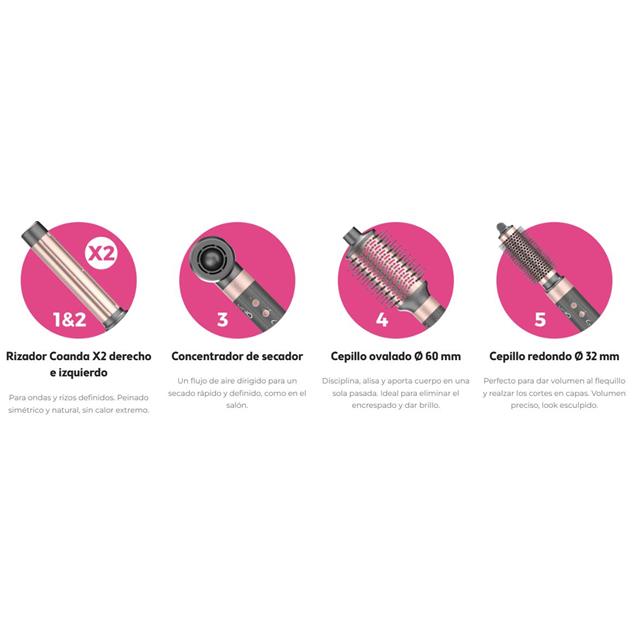 Incluye | 8 cabezales (Secador, cepillo oval, rizadores coanda izquierdo y derecho, difusor, cepillo redondo, cepillo paleta, plancha) |