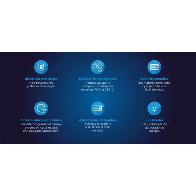 Entre sus funciones se destaca un temporizador de hasta 60 minutos con apagado automático, luz interior para revisar el estado sin abrir la puerta, termostato regulable y varias posiciones para bandejas o rejillas que permiten cocinar en distintos niveles. Está fabricado con gabinete metálico resistente, color silver, y viene con accesorios útiles como bandeja asadora, rejilla y pinza para manipular.