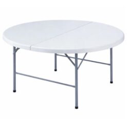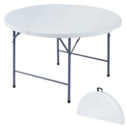 Mesa redonda práctica y funcional, ideal para eventos, reuniones o uso en interiores y exteriores. Cuenta con tapa blanca y estructura metálica resistente, con diseño plegable que facilita el guardado y transporte. Medidas: 122 cm de diámetro x 74 cm de altura. Perfecta para un uso versátil y cómodo.