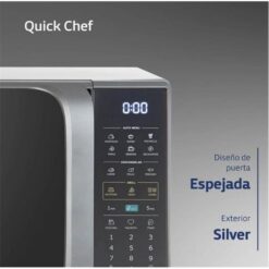 Diseño sofisticado y doble función en tu cocina. Con una capacidad total de 23 litros y sistema bifunción, este microondas digital combina potencia y estilo para transformar tu experiencia diaria. Su exterior color silver con puerta tipo mirror le da un toque moderno y elegante, ideal para cocinas con diseño contemporáneo. Su control digital por membrana y display LED blanco garantizan un uso cómodo e intuitivo.