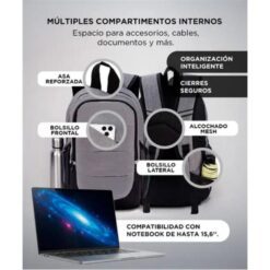 Su puerto USB integrado te permite cargar tus dispositivos mientras te movés, y su cierre con candado de seguridad mantiene todo protegido. Además, sus correas acolchonadas con sistema de amortiguación garantizan el máximo confort, incluso en largas jornadas.