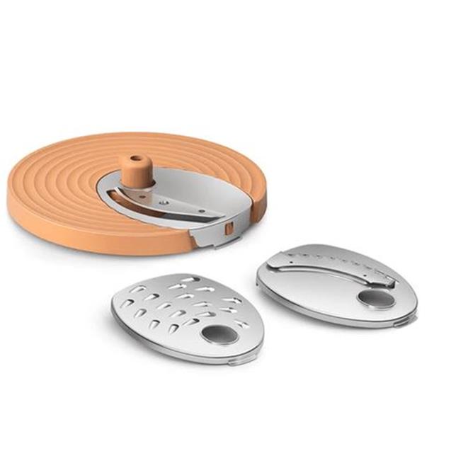 4 accesorios que se adaptan perfectamente a su uso diario. S-Blade, jarra de licuadora de 2 l, disco insertable para rebanar y disco insertable para rallar y preparar sus recetas favoritas