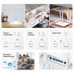 . Mejorá la conexión de tu hogar con este router doble banda, ideal para navegar, trabajar, estudiar y disfrutar de streaming con mayor estabilidad. Su tecnología Wi-Fi 5 AC1200 combina una red de 2.4 GHz para tareas cotidianas y una red de 5 GHz para actividades que requieren más velocidad, como video en alta definición o videojuegos online.