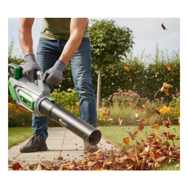 Soplador Dibra inalámbrico. Potente y práctico para limpieza de patios, veredas, garaje y jardín. Funciona con sistema doble batería (2x20V) para lograr mayor empuje de aire, ideal para juntar hojas, polvo y recortes de pasto sin depender de cables.