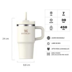 El Vaso Stanley Quencher diseñado para quienes quieren mantener sus bebidas frías por horas mientras están en movimiento. Fabricado en acero inoxidable de doble pared con aislamiento al vacío, su diseño robusto incluye asa cómoda y un sistema de tapa FlowState™ de tres posiciones (sorbete, beber directo o completamente cerrado), que lo hace práctico para usar tanto en casa como fuera. La base estrecha permite que adaptes el vaso fácilmente a muchos portavasos de vehículo. Es una excelente opción si buscás combinar diseño, funcionalidad y durabilidad en tus vasos térmicos.